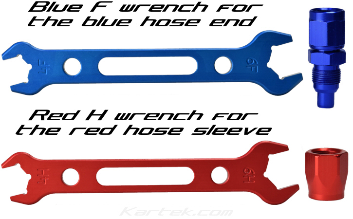 On each wrench you'll see the AN size with a letter F or H. The blue F wrenches are for the blue hose end side of the AN fitting. The red H wrenches are for the red sleeve that goes over the hose. They are on two different wrenches. For example AN #6F is on a separate wrench from AN #6H.